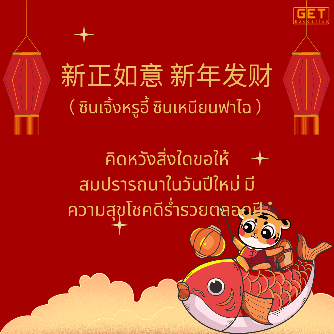 - 新正如意 新年发财 ( ซินเจิ้งหรูอี้ ซินเหนียนฟาไฉ )คิดหวังสิ่งใดขอให้สมปรารถนาในวันปีใหม่ มีความสุขโชคดีร่ำรวยตลอดปี
