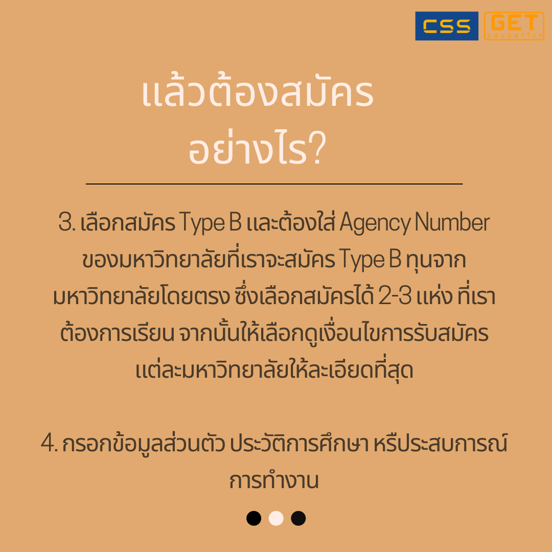 3. เลือกสมัคร Type B และต้องใส่ Agency Number ของมหาวิทยาลัยที่เราจะสมัคร Type B ทุนจากมหาวิทยาลัยโดยตรง ซึ่งเลือกสมัครได้ 2-3 แห่ง ที่เราต้องการเรียน จากนั้นให้เลือกดูเงื่อนไขการรับสมัครแต่ละมหาวิทยาลัยให้ละเอียดที่สุด