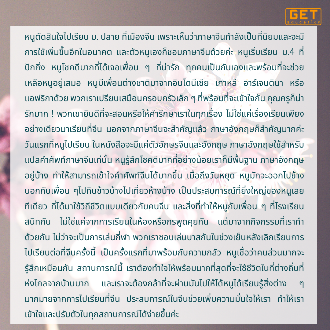 หนูตัดสินใจไปเรียน ม. ปลาย ที่เมืองจีน เพราะเห็นว่าภาษาจีนกำลังเป็นที่นิยม
