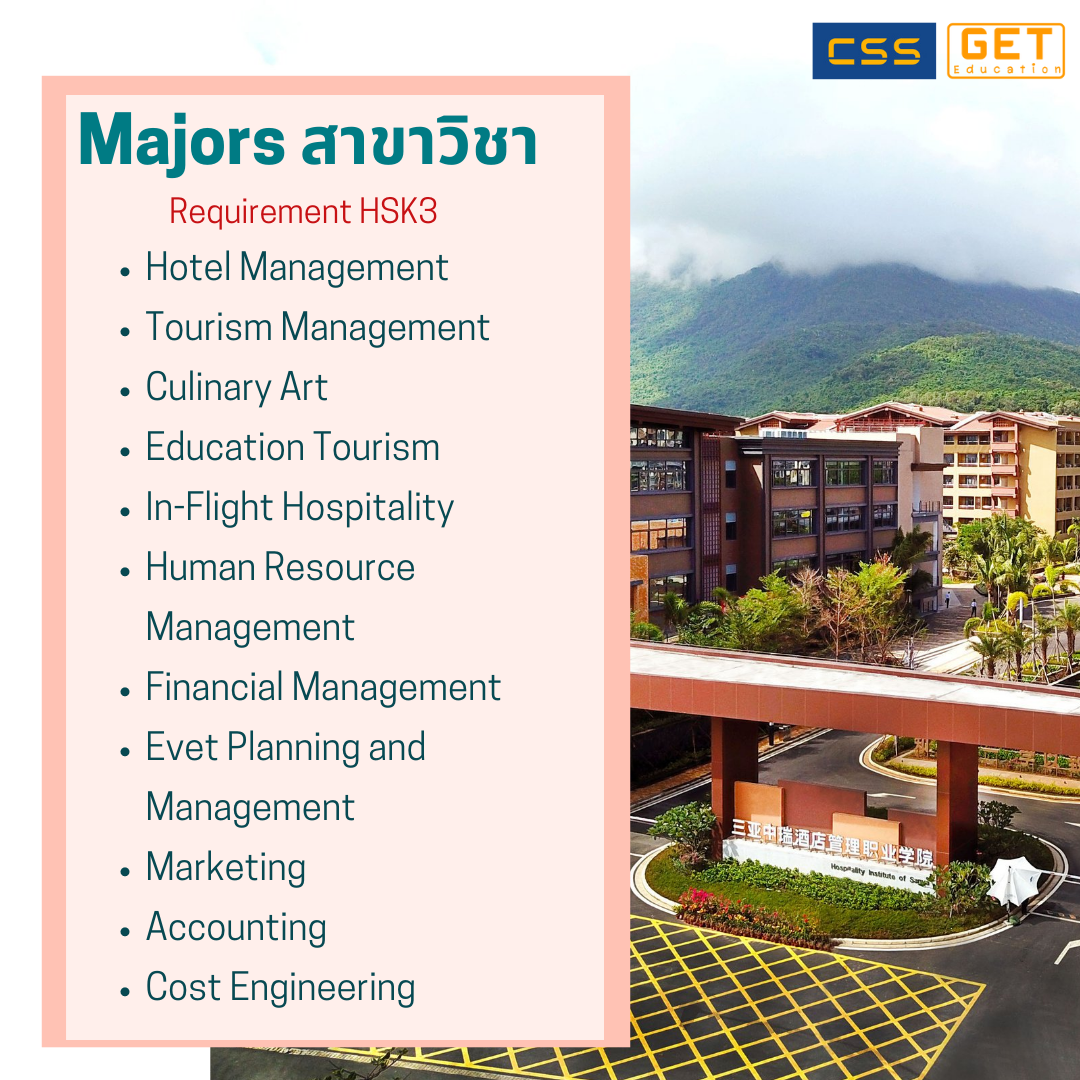 Hospitality Institute of Sanya มุ่งเน้นไปที่สาขาการบริการและมีลักษณะเฉพาะที่โดดเด่น วิทยาลัยเปิดสอนวิชาเอก 6 วิชา ได้แก่ การจัดการโรงแรม การจัดการล่องเรือระหว่างประเทศ งานฝีมืออาหารตะวันตก การจัดการการท่องเที่ยว (การตลาดออนไลน์) การจัดการทางการเงิน และการจัดการทรัพยากรมนุษย์ สิ่งเหล่านี้เป็นวิชาเอกทั้งหมดในการสร้างเกาะท่องเที่ยวระหว่างประเทศของไห่หนานและการขาดแคลนผู้มีความสามารถในสาขาที่เกี่ยวข้องทั่วประเทศ ทิศทางการฝึก