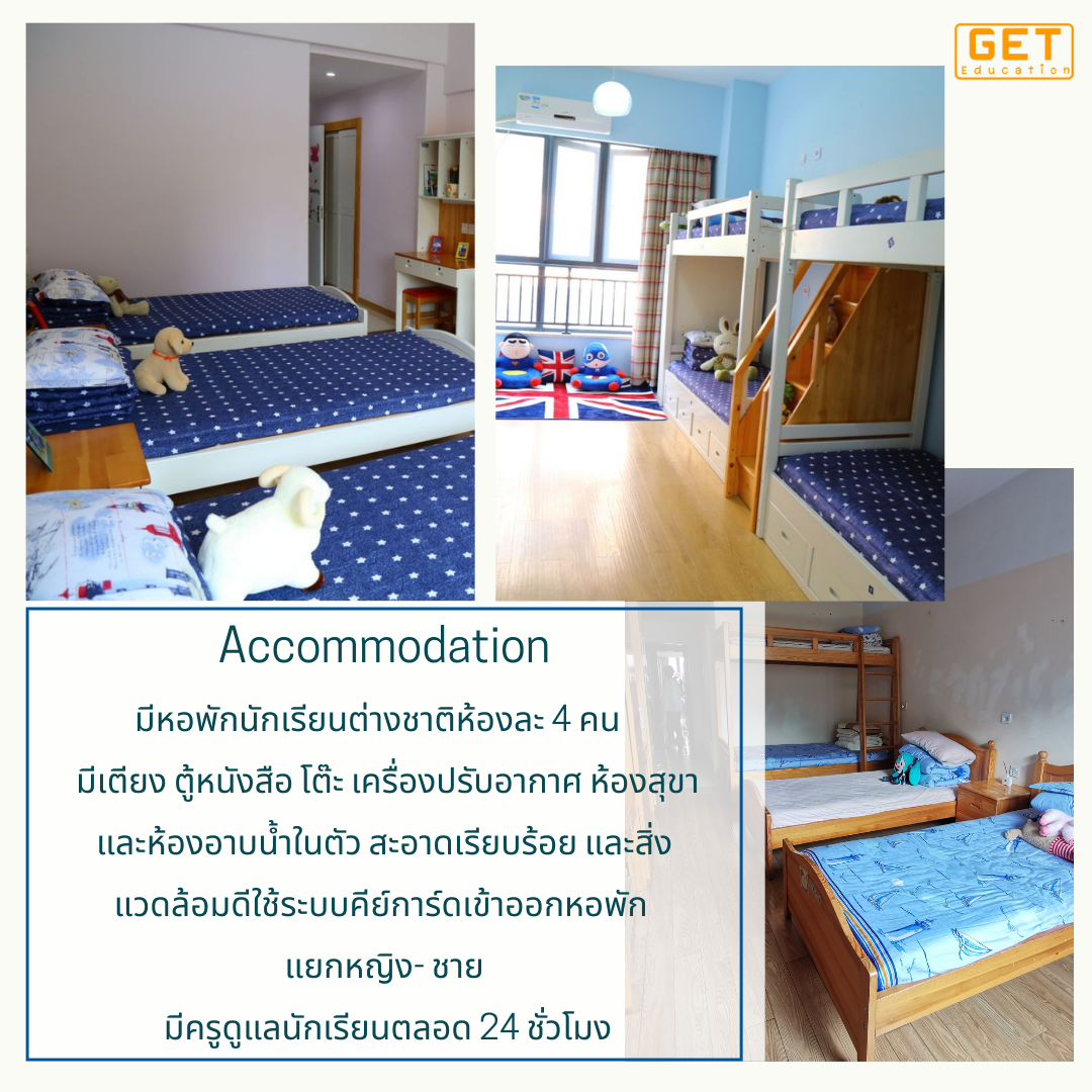 มีหอพักนักเรียนต่างชาติห้องละ 4 คน มีเตียง ตู้หนังสือ โต๊ะ เครื่องปรับอากาศ ห้องสุขาและห้องอาบนํ้าในตัว