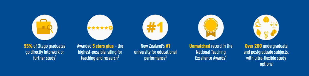 เป็นมหาวิทยาลัยที่เก่าแก่ที่สุดของนิวซีแลนด์และยังเป็นมหาลัยที่ติดอันดับท๊อป 1 % ของมหาวิทยาลัยทั่วโลกและยังเป็นมหาวิทยาลัยอันดับ 2 ของประเทศนิวซีแลนด์ วิทยาเขตหลักของมหาวิทยาลัยตั้งอยู่ใน Dunedin ได้รับการยกย่องให้เป็นหนึ่งในวิทยาเขตที่สวยงามที่สุด นอกจากนี้ยังมีวิทยาเขตอีกสามแห่งตั้งอยู่ใน Christchurch, Wellington และ Invercargill เปิดสอนสาขาวิชาเฉพาะทางนักศึกษามีโอกาสเพลิดเพลินไปกับการใช้ชีวิตภายในหอพักของมหาวิทยาลัยภายใต้สภาพแวดล้อมที่เป็นมิตรใน Dunedin ควบคู่ไปการเข้าร่วมชมรมที่มีมากกว่า 150 ชมรมตั้งอยู่ในเมือง Dunedin เมืองที่ปลอดภัยและค่อนข้างเงียบสงบ เดินทางสะดวก ตัวมหาวิทยาลัยใกล้กับสิ่งอำนวยความสะดวกมากมายในระยะเดิน ถือเป็นเมืองการศึกษามีนักเรียนจากทั่วประเทศนิวซีแลนด์ และนักเรียนนานาชาติเดินทางมาจากทั่วโลกเพื่อศึกษาต่อ ตั้งแต่ระดับประถม มัธยม จนถึงมหาวิทยาลัย