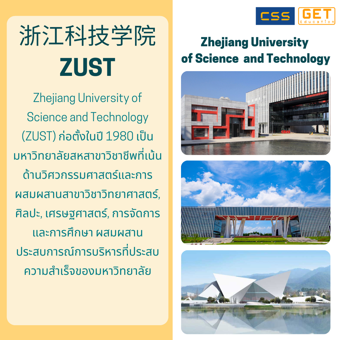 ZHEJIANG UNIVERSITY OF SCIENCE AND TECHNOLOGY 浙江科技学院 (ZUST) ก่อตั้งในปี 1980 เป็นมหาวิทยาลัยสหสาขาวิชาชีพที่เน้นด้านวิศวกรรมศาสตร์และการผสมผสานสาขาวิชาวิทยาศาสตร์, ศิลปะ, เศรษฐศาสตร์, การจัดการ และการศึกษา ผสมผสานประสบการณ์การบริหารที่ประสบความสำเร็จของมหาวิทยาลัย
